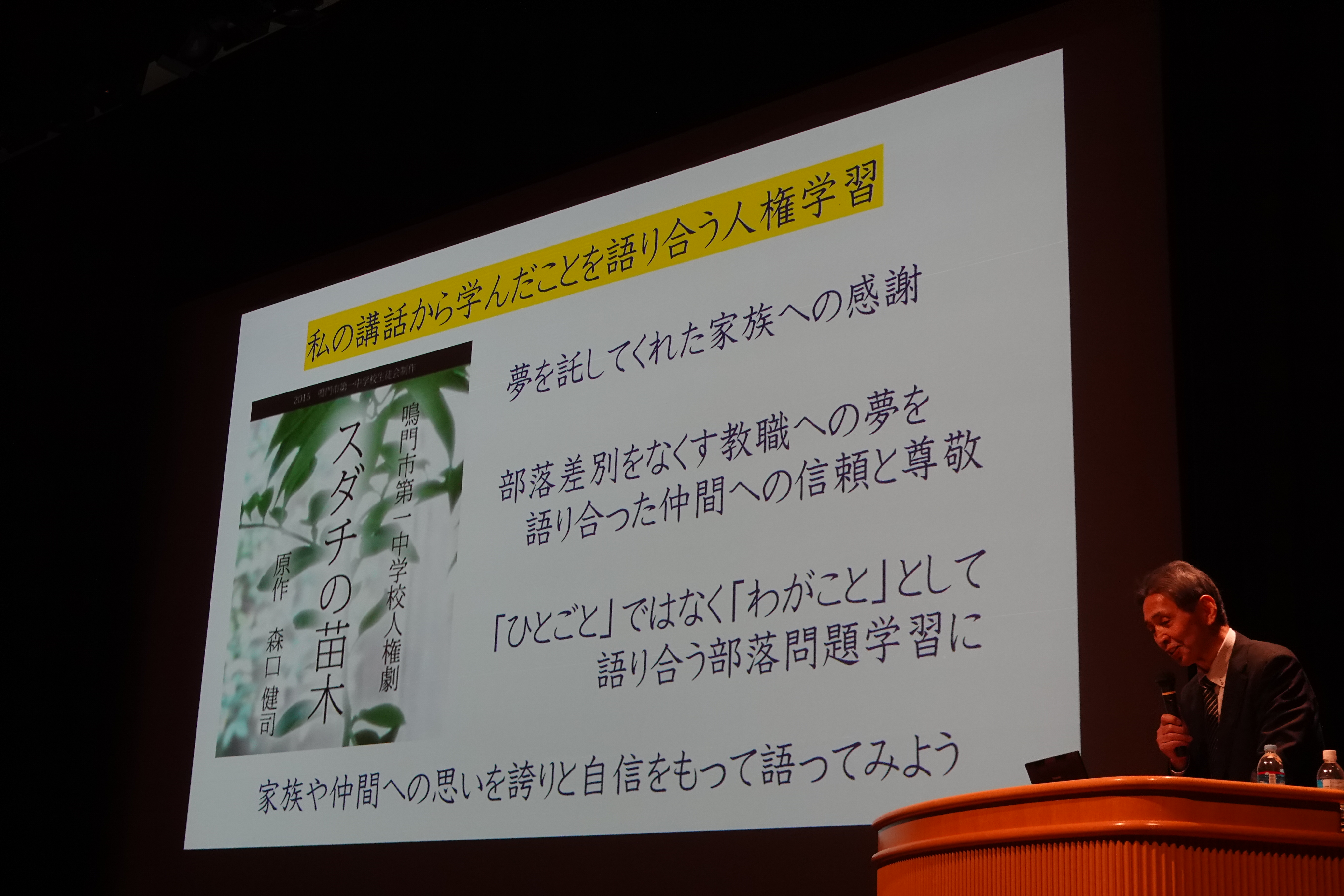 2015年度、鳴門市第一中学校の生徒会本部役員によって道徳資料「スダチの苗木」が、部落問題をテーマとした映像劇となり、部落問題を「わがこと」として、仲間や家族への思いを語り合う人権学習の教材として活用される。